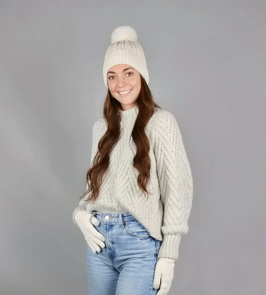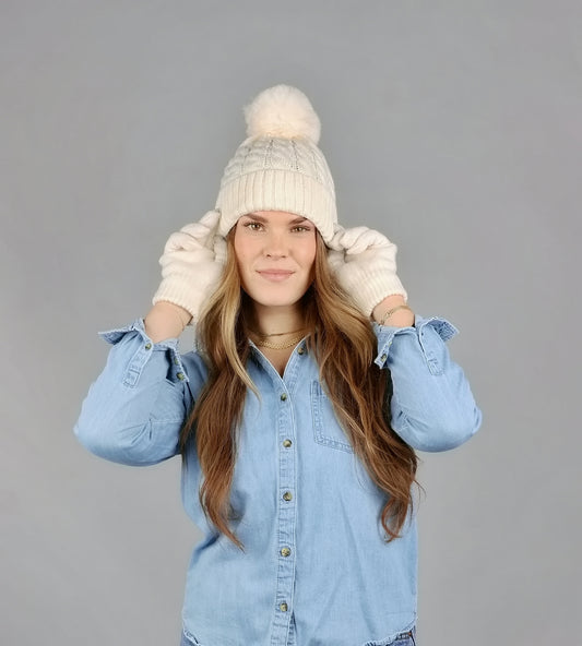 CHENILLE CABLE BEANIE FUR LINING & MATCHING TEXT GLOVE SET