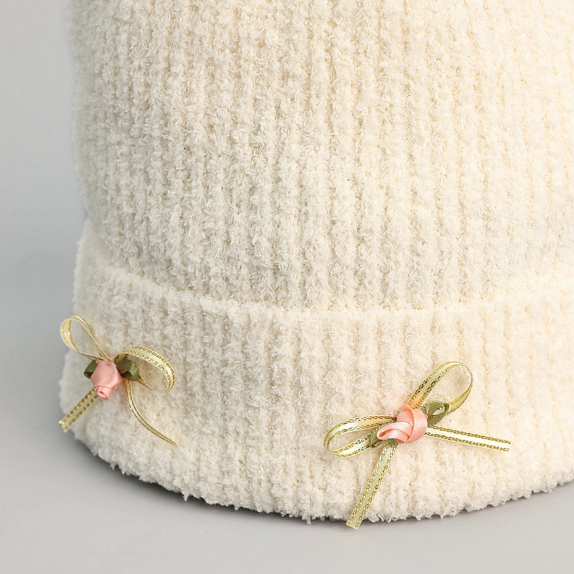 –Mini satin rosettes sewn over gold trimmed satin bows