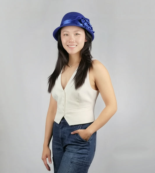 SATIN FLOWER FELT CLOCHE with FEATHER TRIM