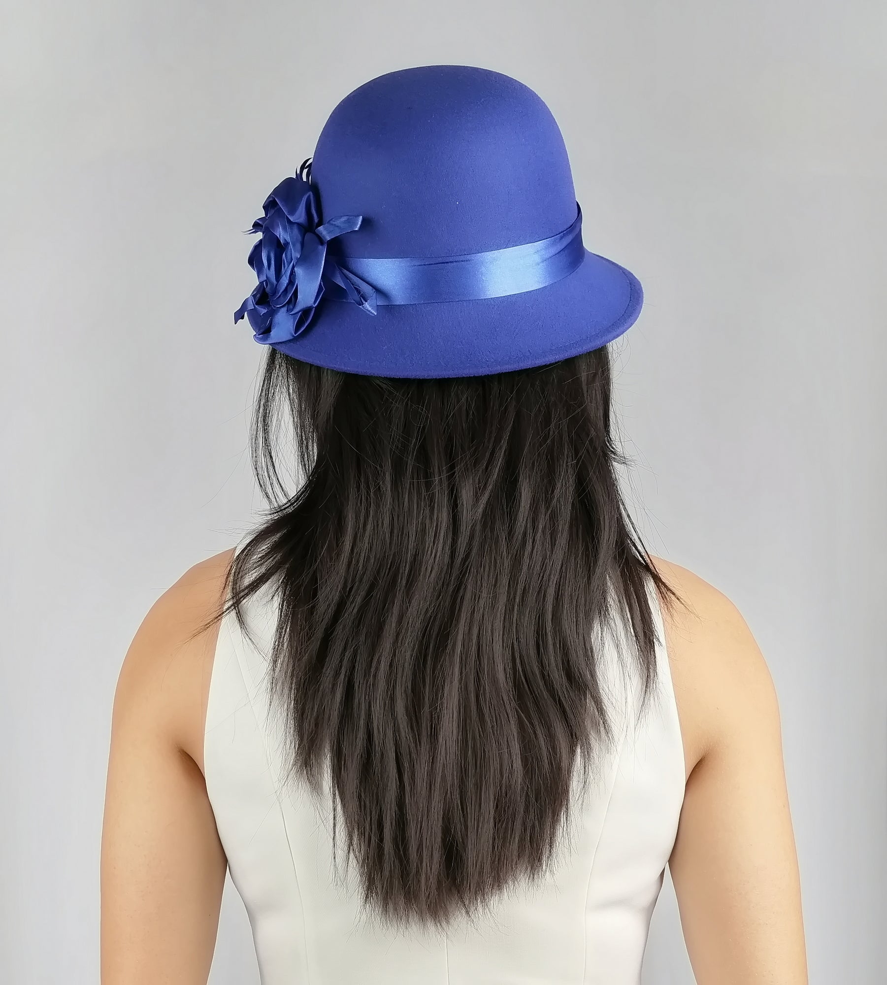 SATIN FLOWER FELT CLOCHE with FEATHER TRIM