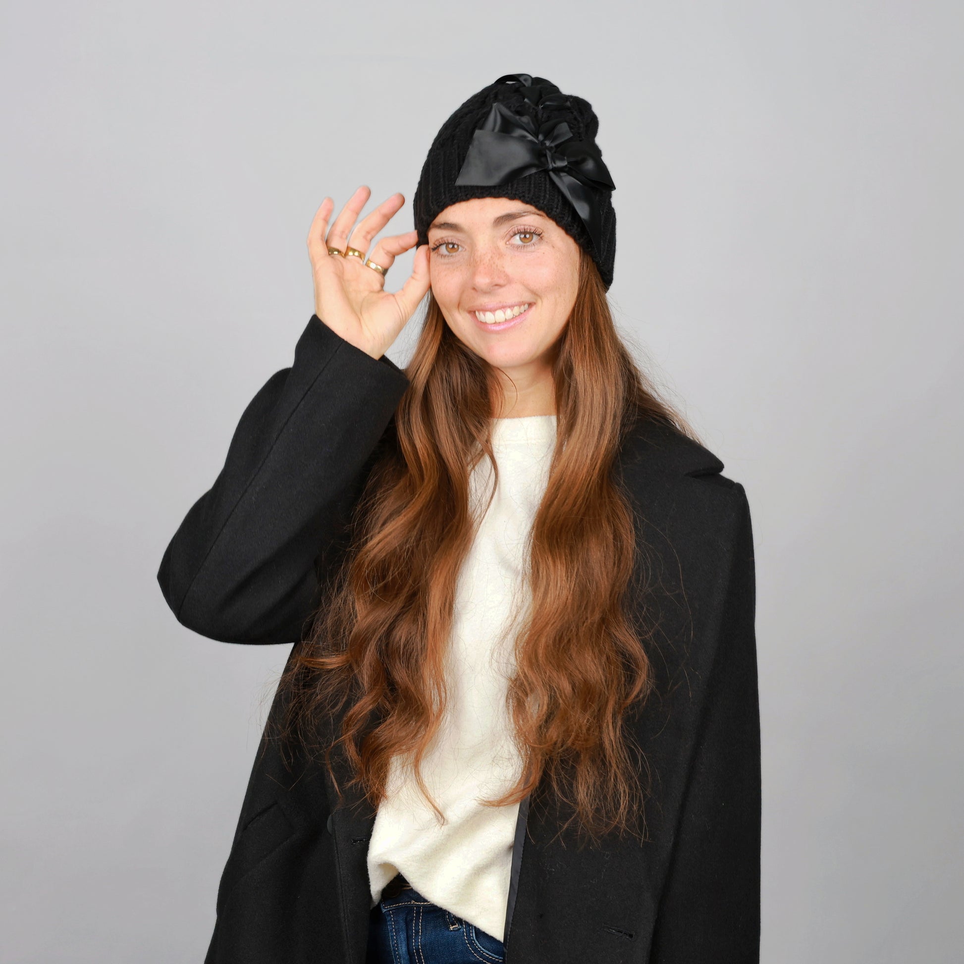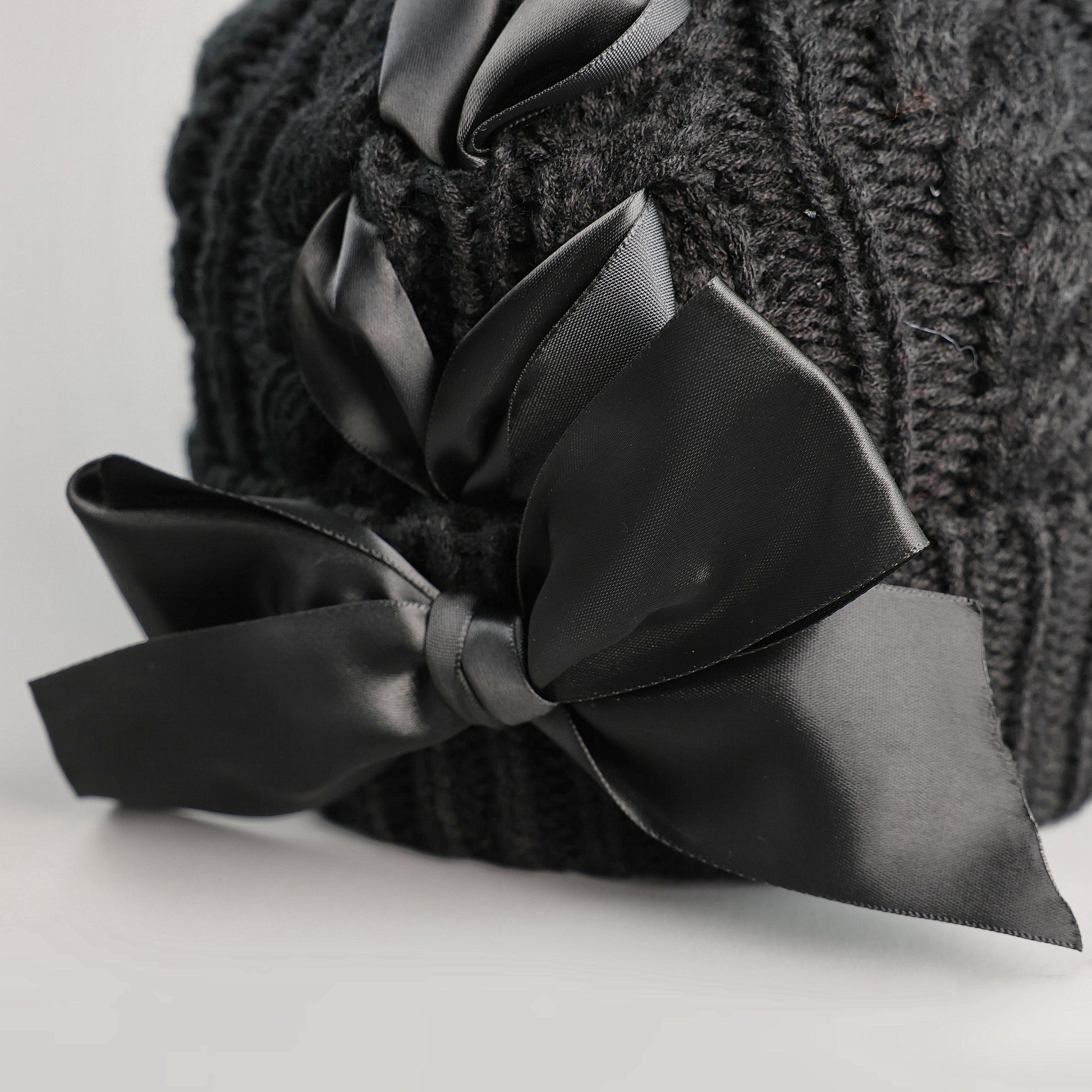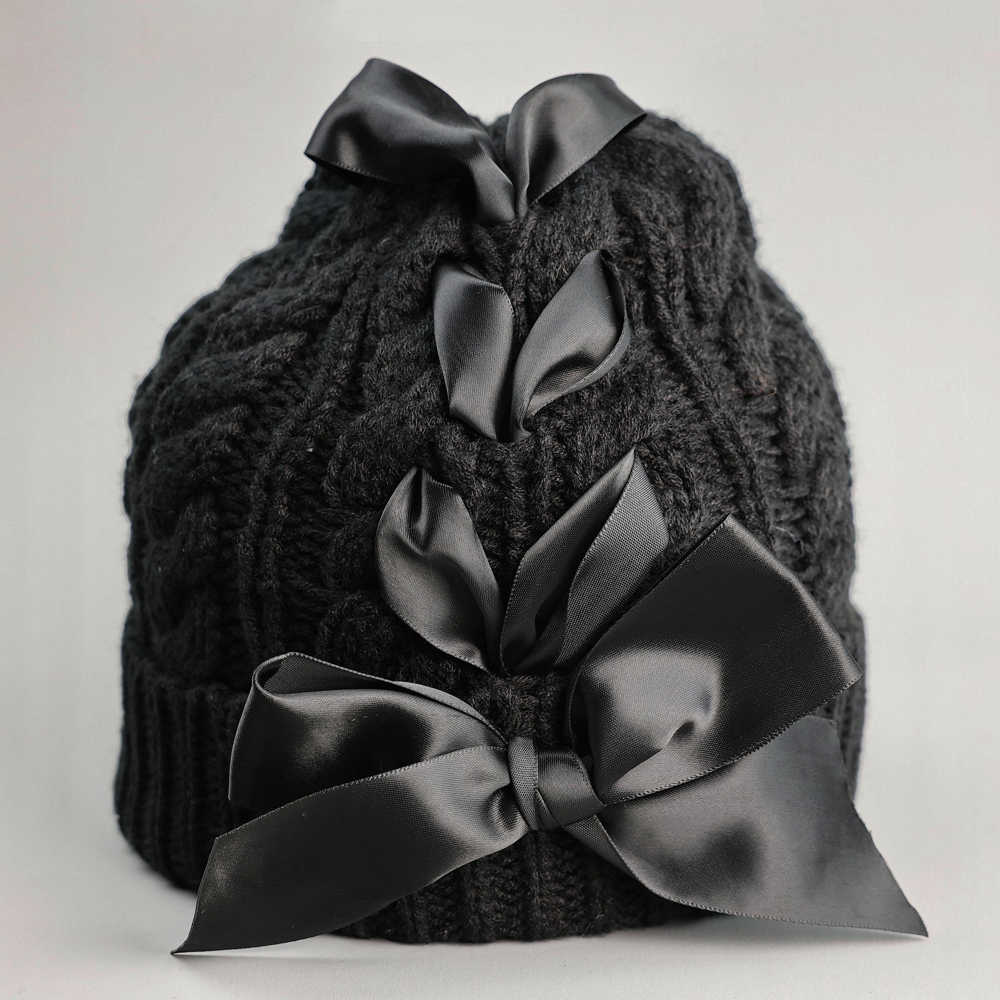 –Soft cable cuffed knit beanie with lace up satin ribbon detail