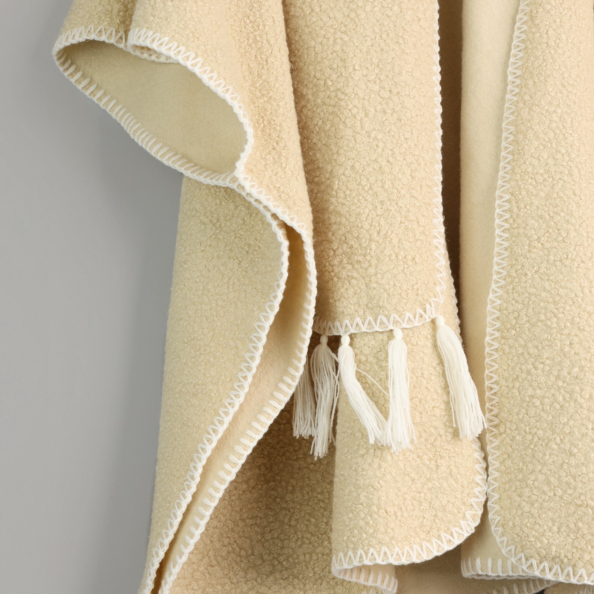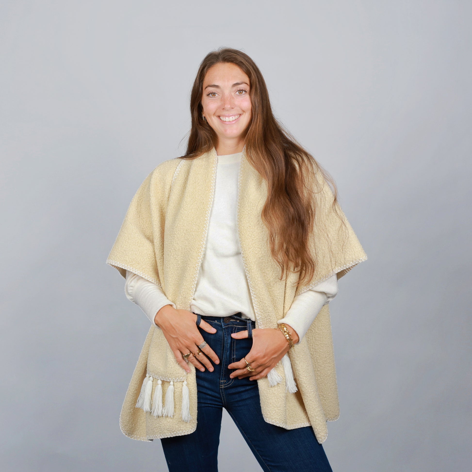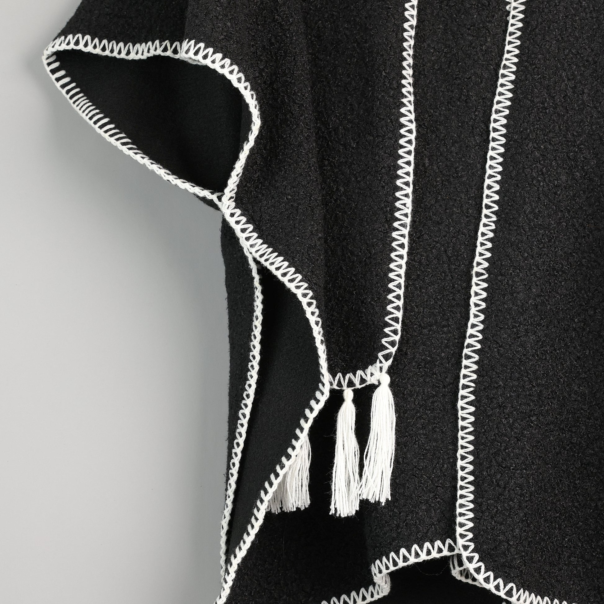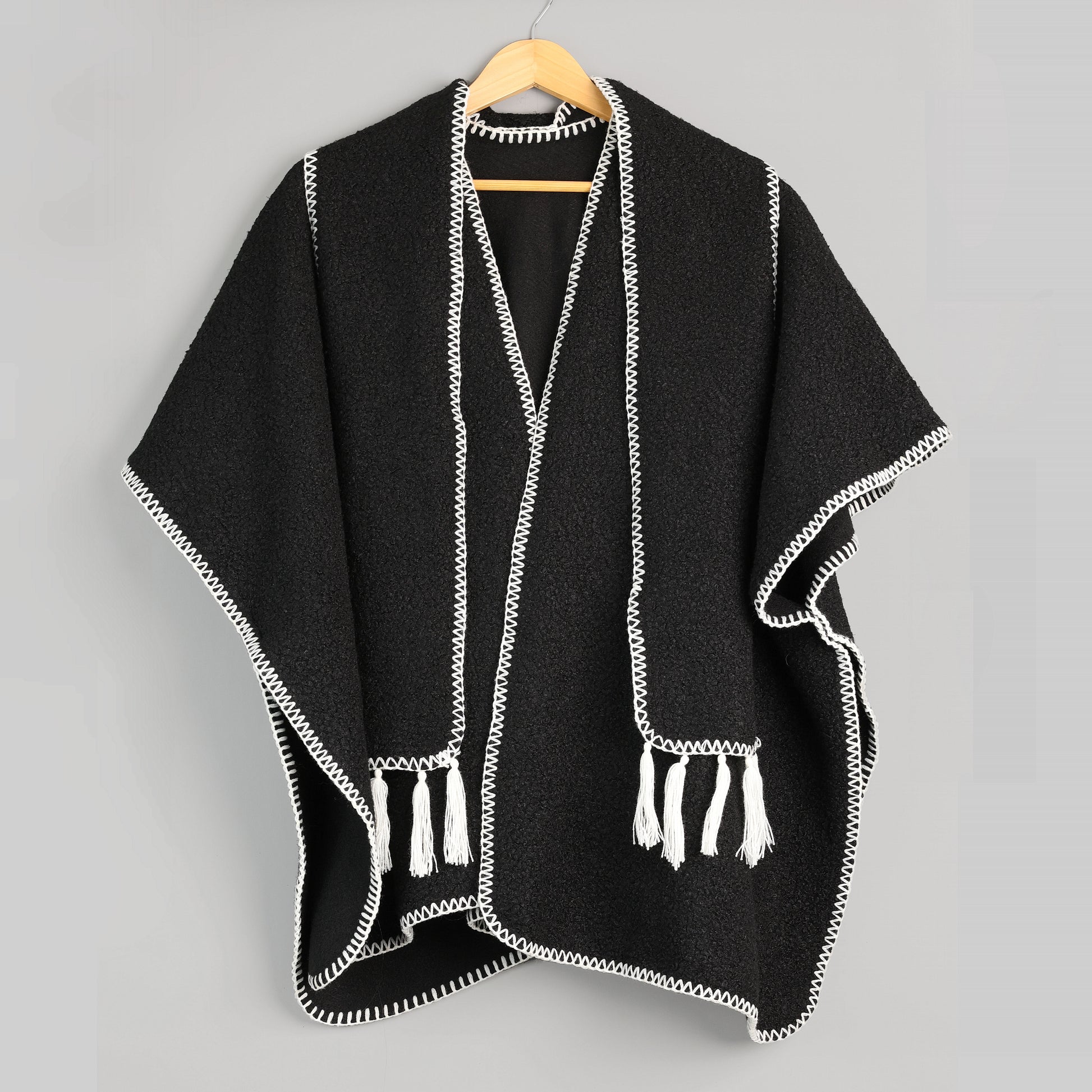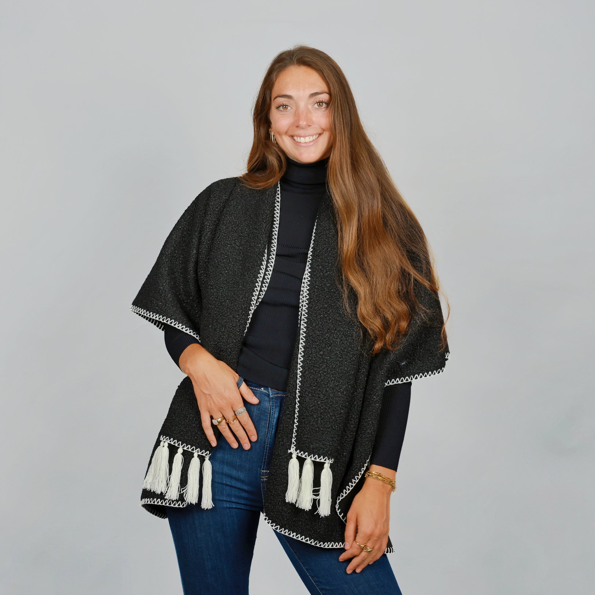 –Two in one wrap and attached scarf with blanket edge stitch detail