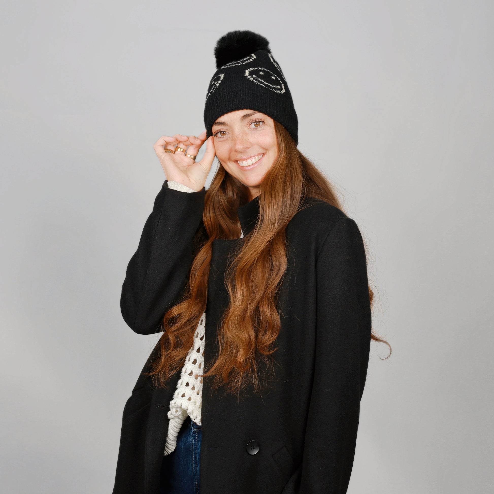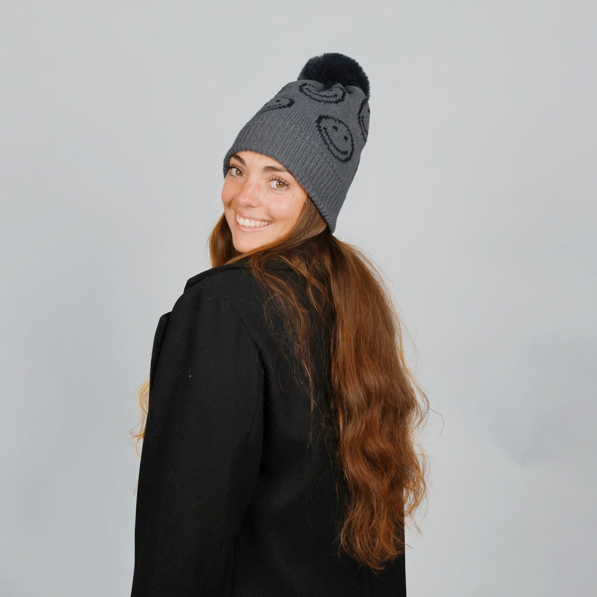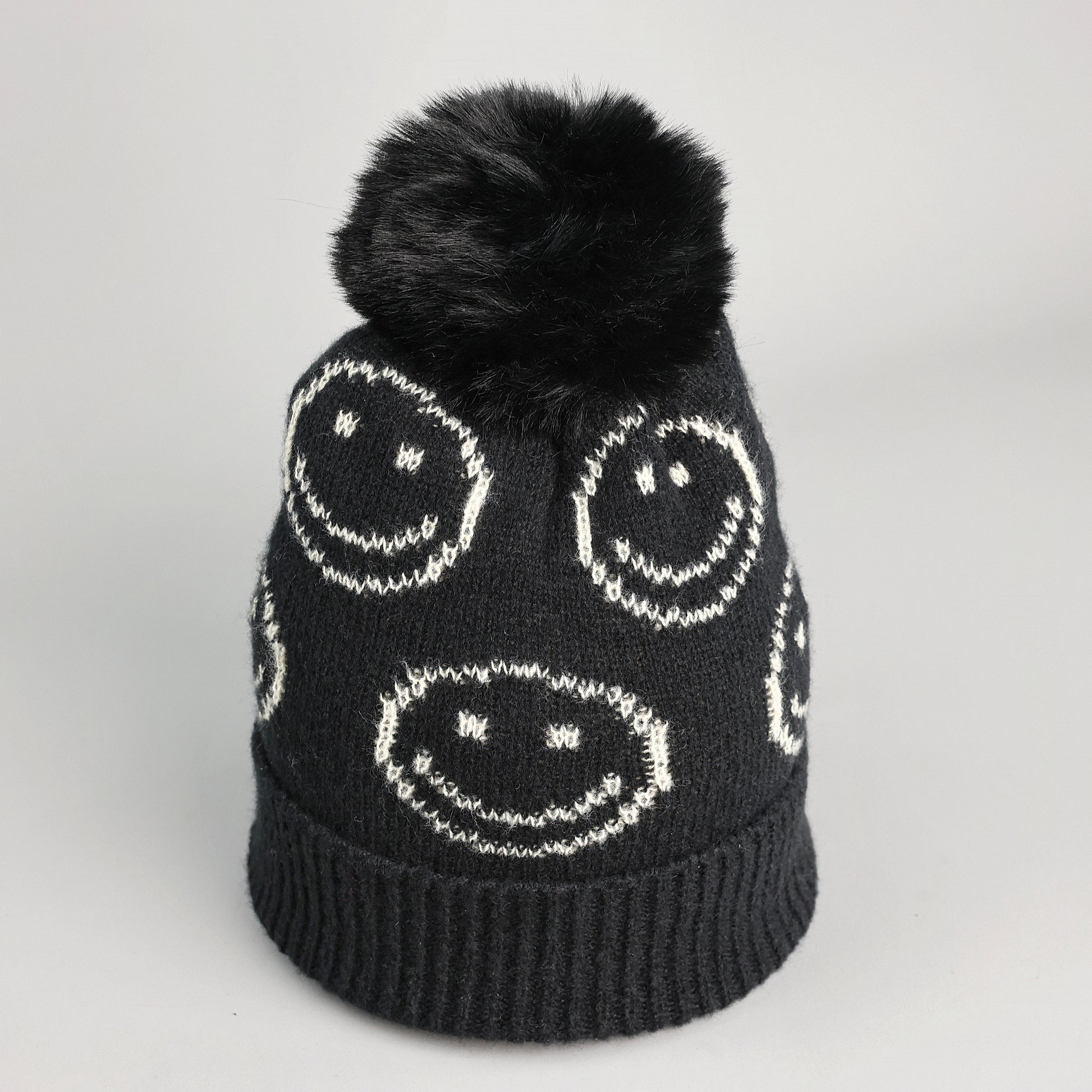 –Knit in smiley beanie with soft faux fur pom pom and rolled cuff