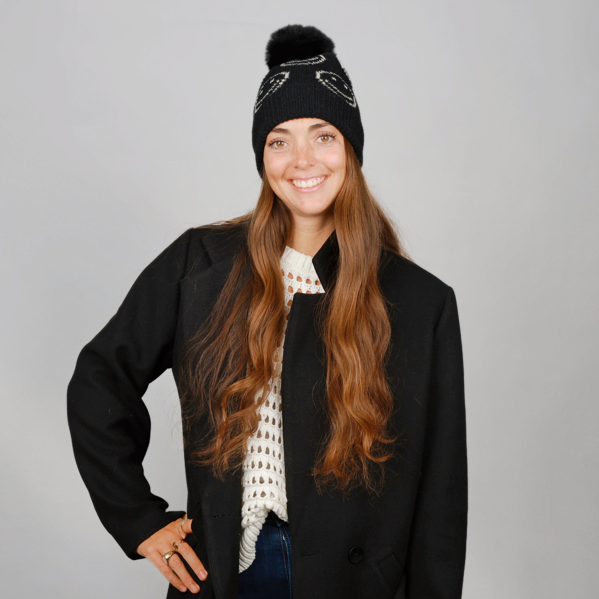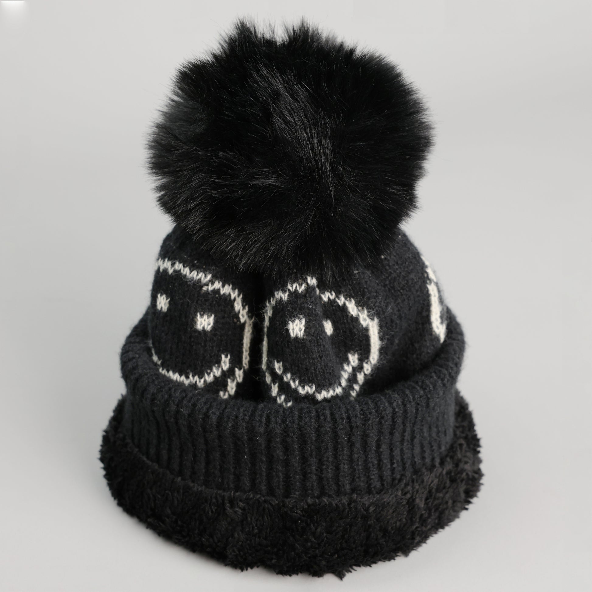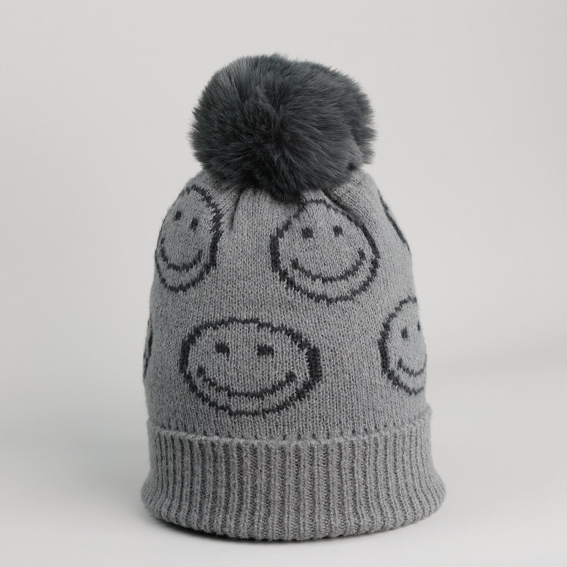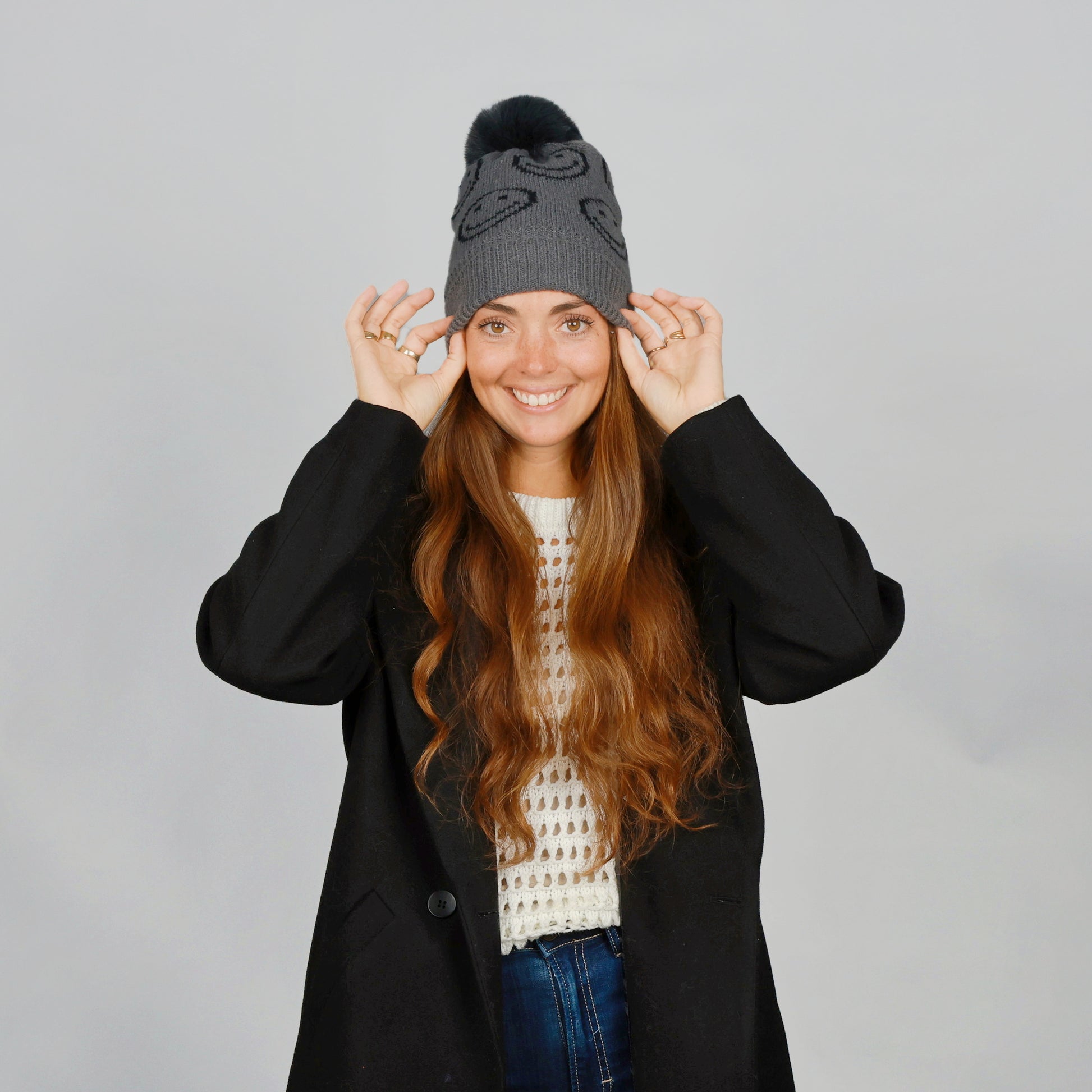 –Knit in smiley beanie with soft faux fur pom pom and rolled cuff
