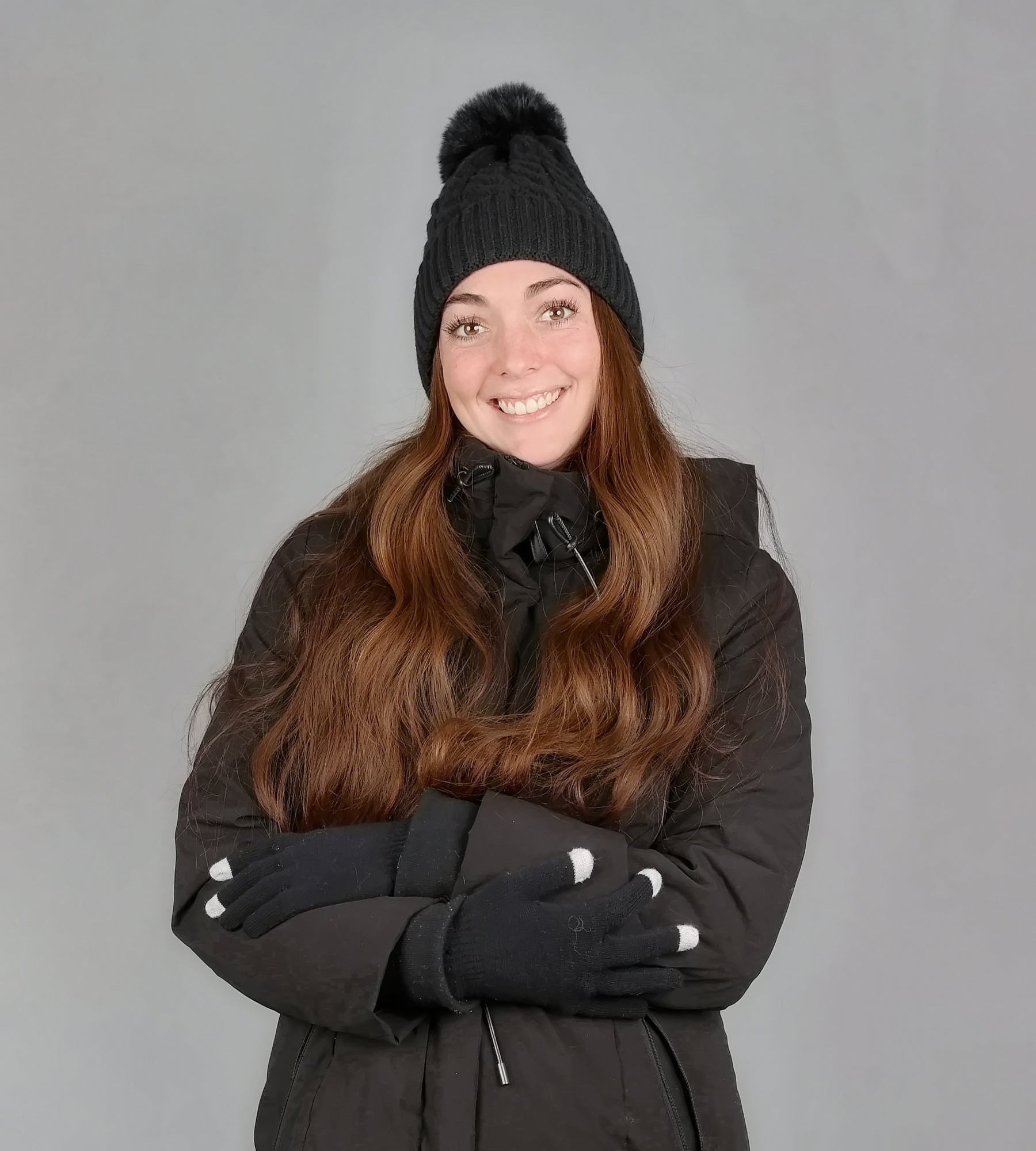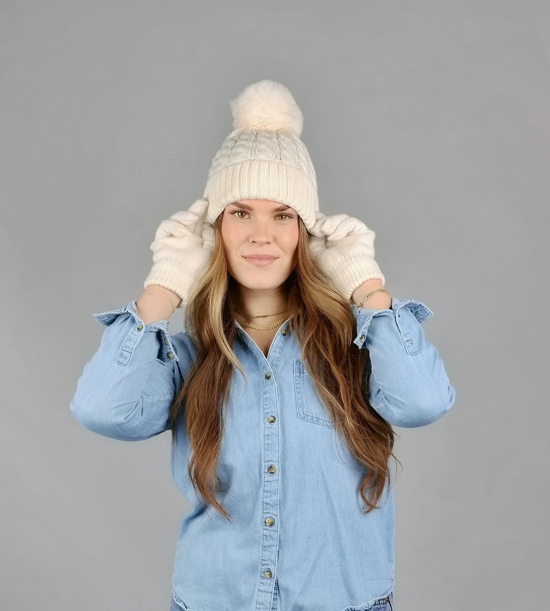 – Cable knit beanie with beautiful faux fur pom